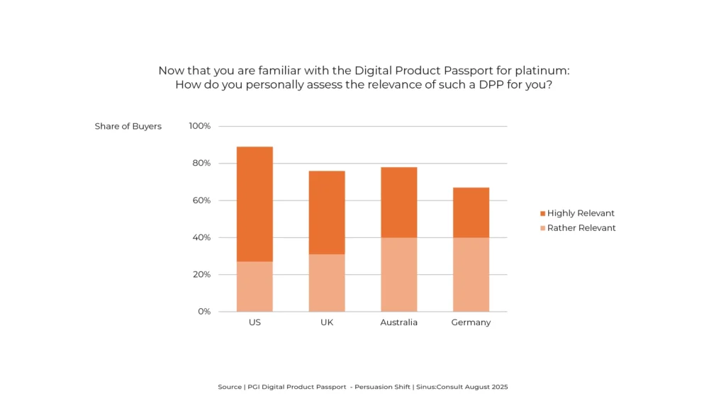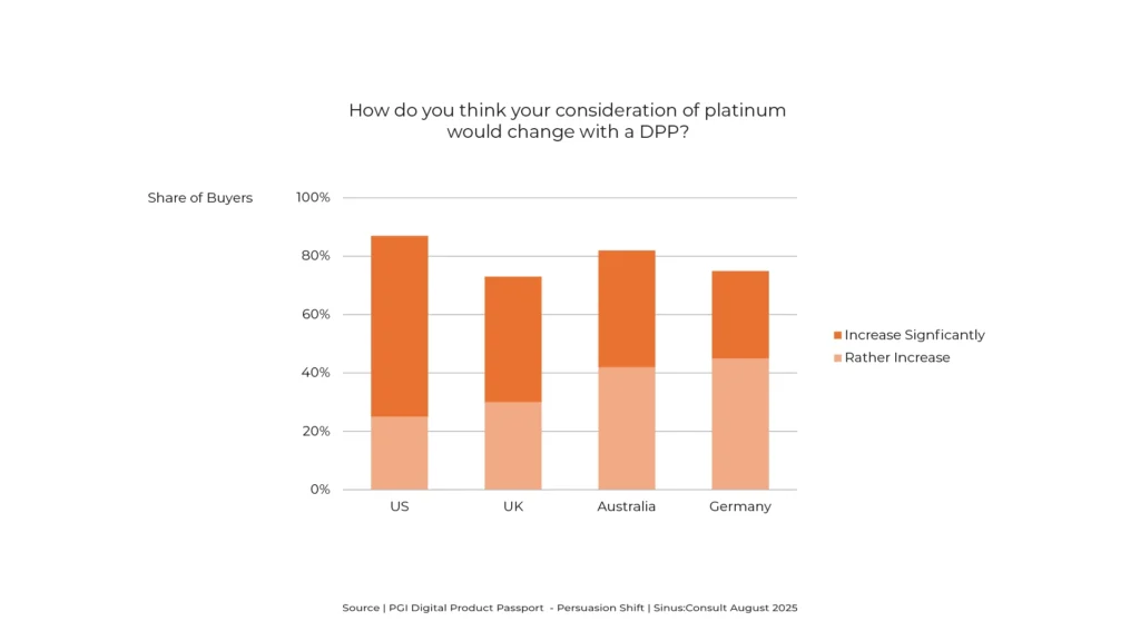 Most jewellery buyers say they would be more likely to consider platinum if it came with a Digital Product Passport. The presence of a DPP boosts perceived credibility and relevance of the metal, making platinum a more attractive choice. (Source: PGI Digital Product Passport – Persuasion Shift) Interpretation Platinum has historically been under-considered compared to […]