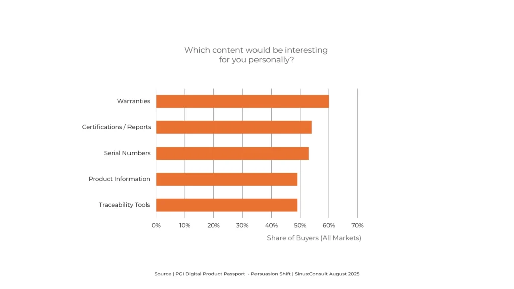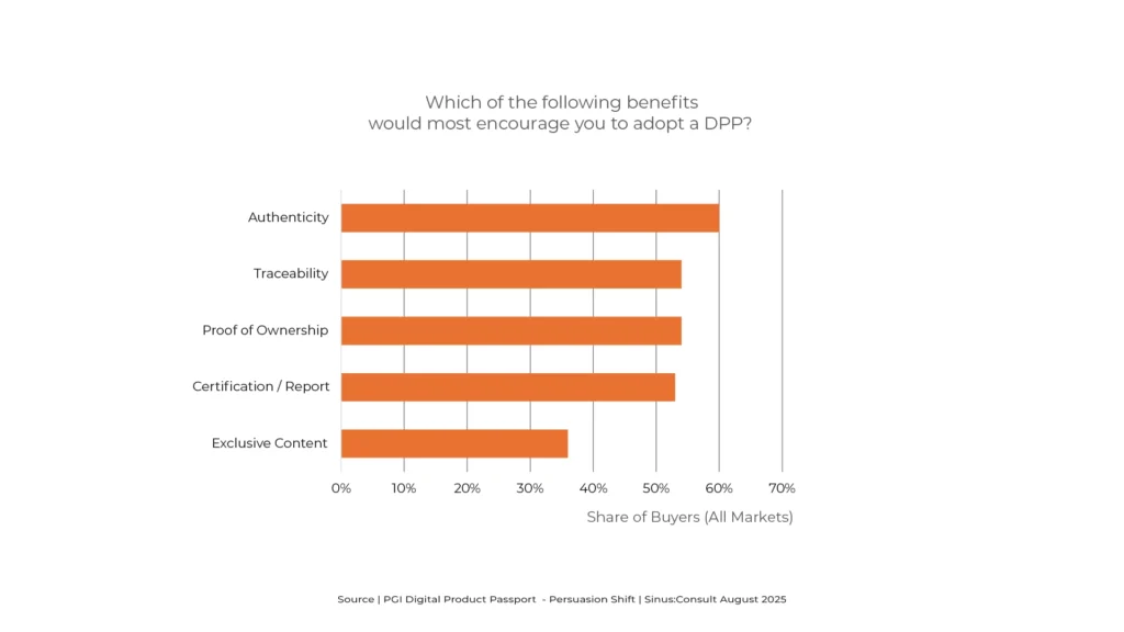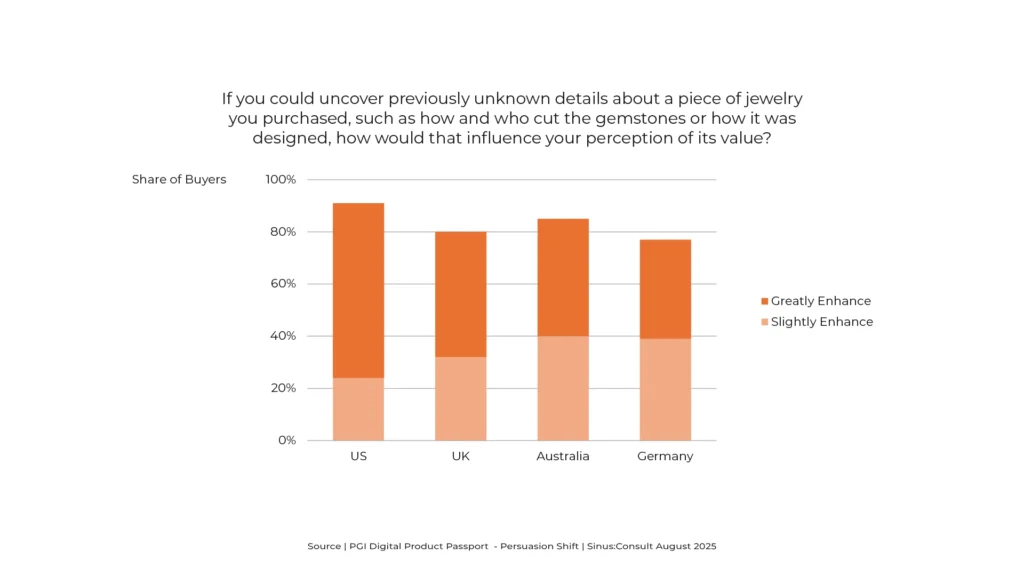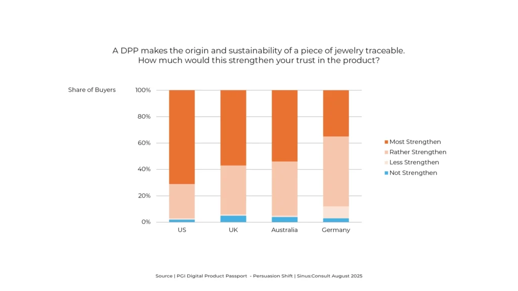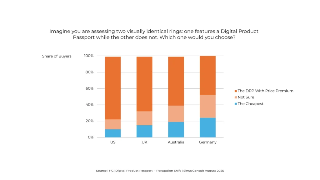 Jewellery buyers across all surveyed markets rate the Digital Product Passport as highly relevant to them personally. This suggests widespread recognition of its value, regardless of geography or market maturity. (Source: PGI Digital Product Passport – Persuasion Shift) Interpretation The perceived relevance of a DPP is not limited to niche audiences or trend-conscious buyers. It […]